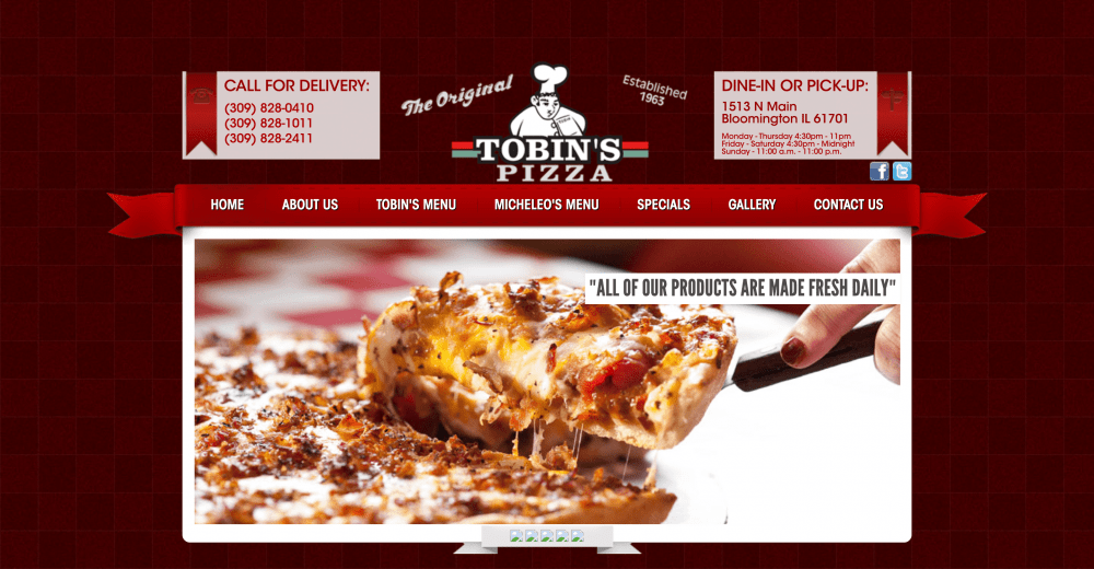 Tobin's Pizza has been a serving our community with fantastic food since 1963. Cybernautic® is one of the top Bloomington web design companies. Together, we worked on a vision to create a website that showed off their branding & story for the world to see!